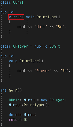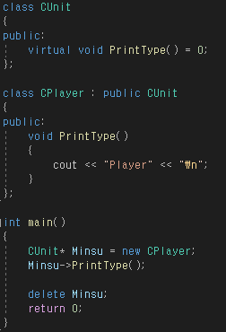 함수 앞에 virtual 키워드를 통해 사용할 수 있다.