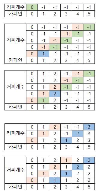 이때 모든 칸을 -1로 초기화 한후 필요한 카페인이 0일땐 커피를 마시지 않아도 되므로 0으로 초기화한다.