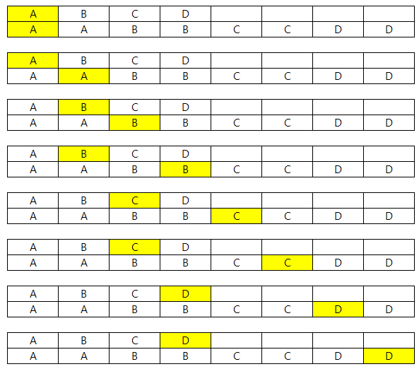 2배로 늘려주지 않은 문자열 하나당 2배로 늘려준 문자열 2개씩 비교한다.