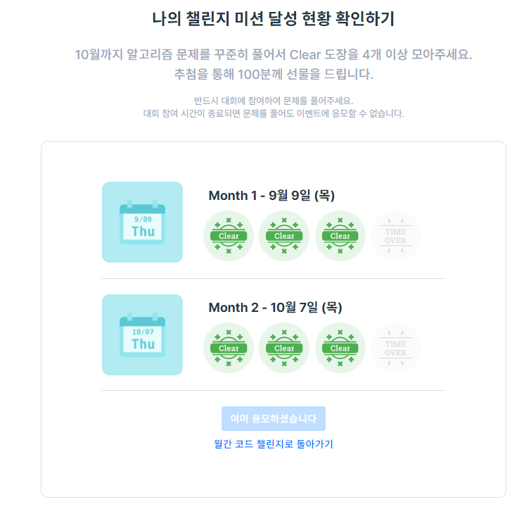 월간 코드챌린지에서 4 문제 이상 풀었어도 응모하기 버튼을 안누르면 응모가 안되는 거 같다.
